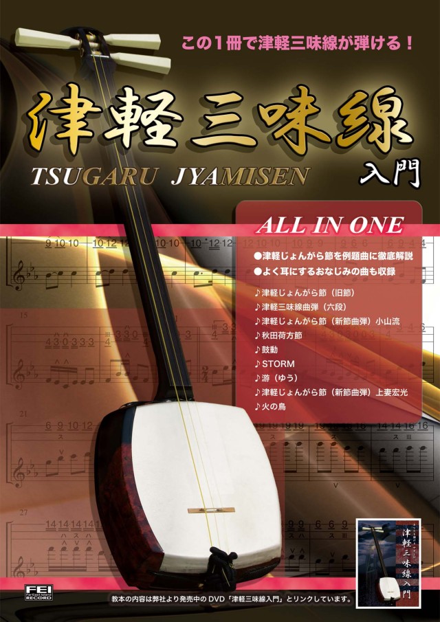 音を出す前に─各部名称・譜尺と膝ゴムのつけ方・駒・指スリの付け方・構え方/音を出してみよう─調弦について・バチの持ち方・糸の叩き方(ウチ)・糸の押さえ方・押しバチ・スリ・糸の替え方・保存・取扱い/練習曲を弾いてみよう─じょんがら節の簡単バージョンその1・2・じょんがら節(旧節)の前弾き部分/楽譜収録曲─津軽じょんがら節(旧節)・津軽三味線曲弾(六段)・津軽じょんがら節(新節曲弾)小山流・秋田荷方節・鼓動・STORM・游・津軽じょんがら節(新節曲弾)上妻宏光・火の鳥(A4判64頁)